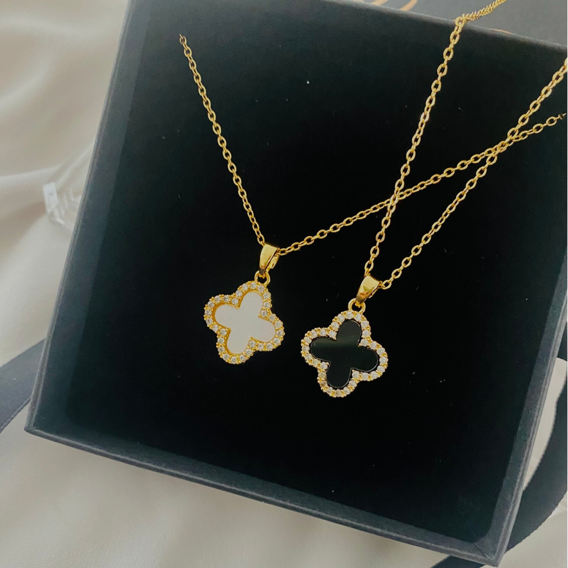 Diese Halskette ist ein Must-Have für dieses Jahr. Eine Seite der Halskette mit schwarzem Anhänger und die andere Seite mit Perlmuttahänger.