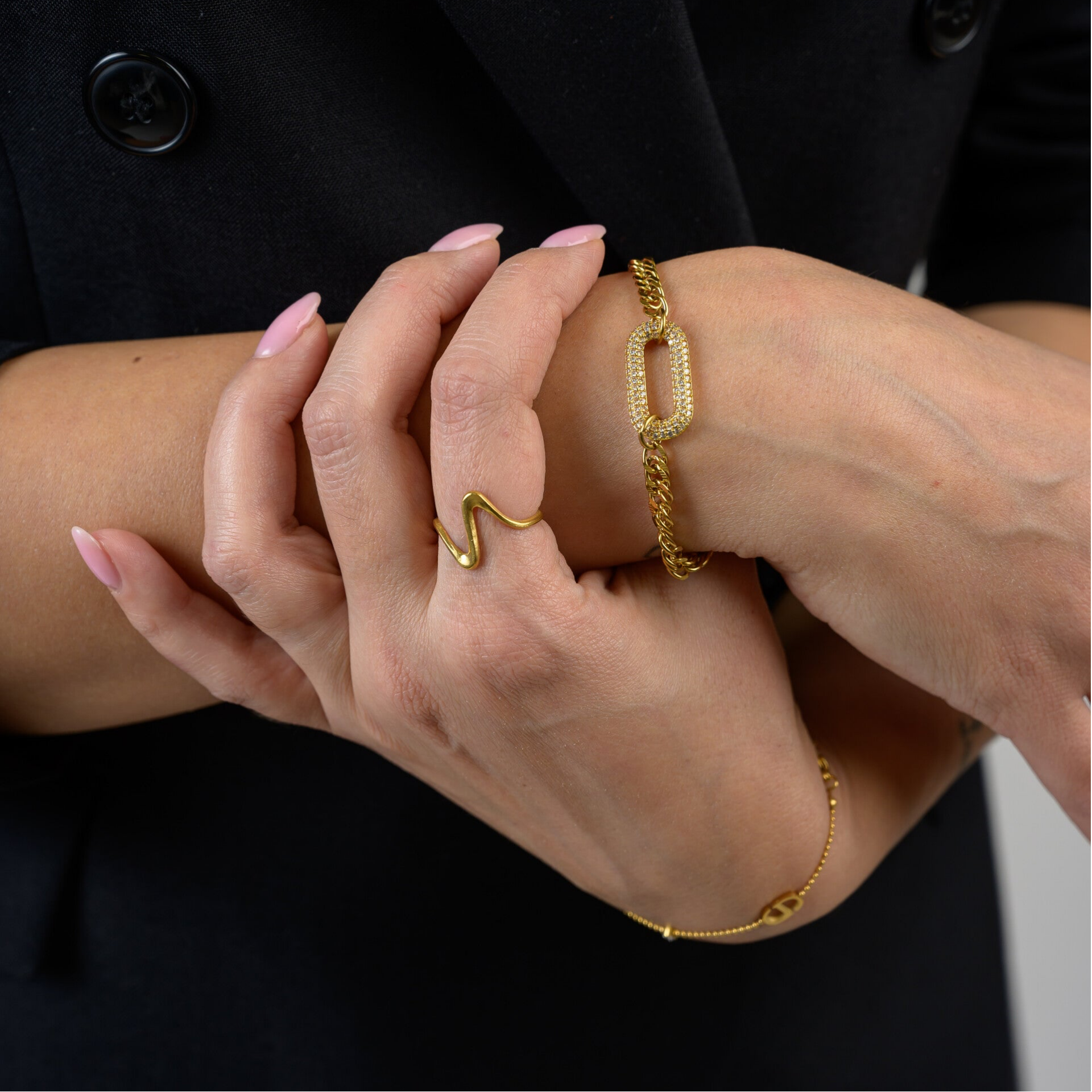 Schönes Armband mit Zirkonia Steinen.Farbe: GoldMaterial: Edelstahl 16k vergoldet, Zirkonia SteinenGewicht: 15g