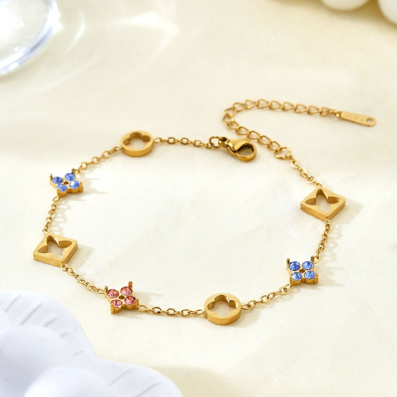 Feines Armband mit Blumen und farbigen Steinen (hellblau und rosa). Material: 304 Edelstahl, 18k vergoldet mit Zirkonia SteinenFarbe: GoldLänge: 19cm und 4cm Verschluss